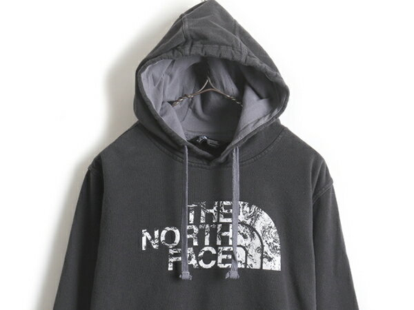 【10/8 マラソン7倍!】 人気 黒 ■ ノースフェイス ビッグロゴ プリント スウェット フード パーカー ( メンズ L ) The North Face トレーナー スエット 2トーン| 中古 裏起毛 プルオーバー プリントパーカー フードパーカー ロゴパーカー フーディー ブラック チャコール